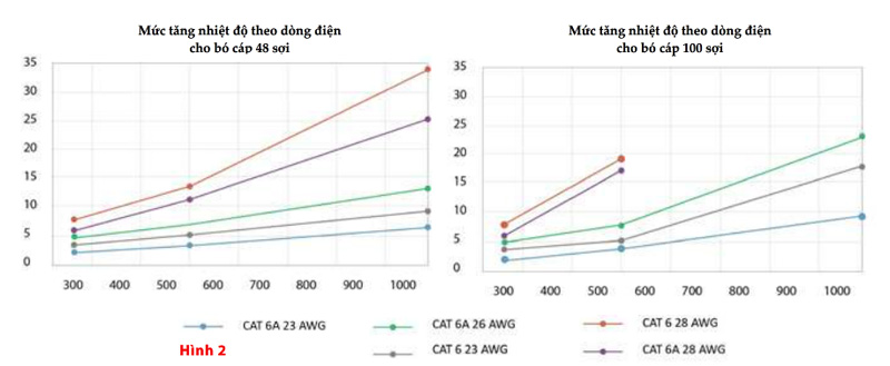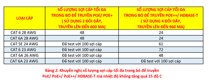 Hình 2 cho kết quả thí nghiệm với bó cáp gồm 48 và 100 sợi. Ta nhận thấy cáp Cat.6A 23 AWG sẽ có mức tăng nhiệt độ ít nhất và Cat.6 28 AWG có mức tăng nhiệt độ nhiều nhất. Tham chiếu kích thước cáp trong bó theo bảng 2 là điều quan trọng để lựa chọn số lượng cáp tạo thành bó trước khi thi công lắp đặt. Ví dụ: Sử dụng 48 sợi cáp để truyền 480 mA và 71 W PoE sẽ cần hai bó cáp Cat.6 24 AWG (mỗi bó 24 sợi) hoặc gom thành một bó cáp Cat.6 23 AWG 48 sợi.